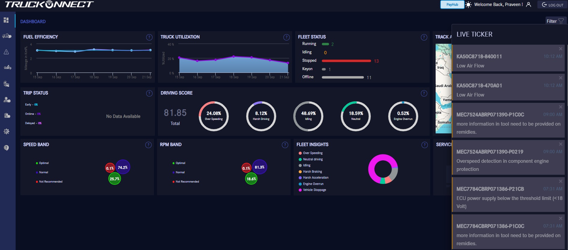 The landing page of “Truckonnect” Application is “Dashboard”. This page comprises of trend patterns for six key KPIs of the fleet along with a feature called “DTC Live Ticker” which provides real time information of Error codes as soon as one is detected