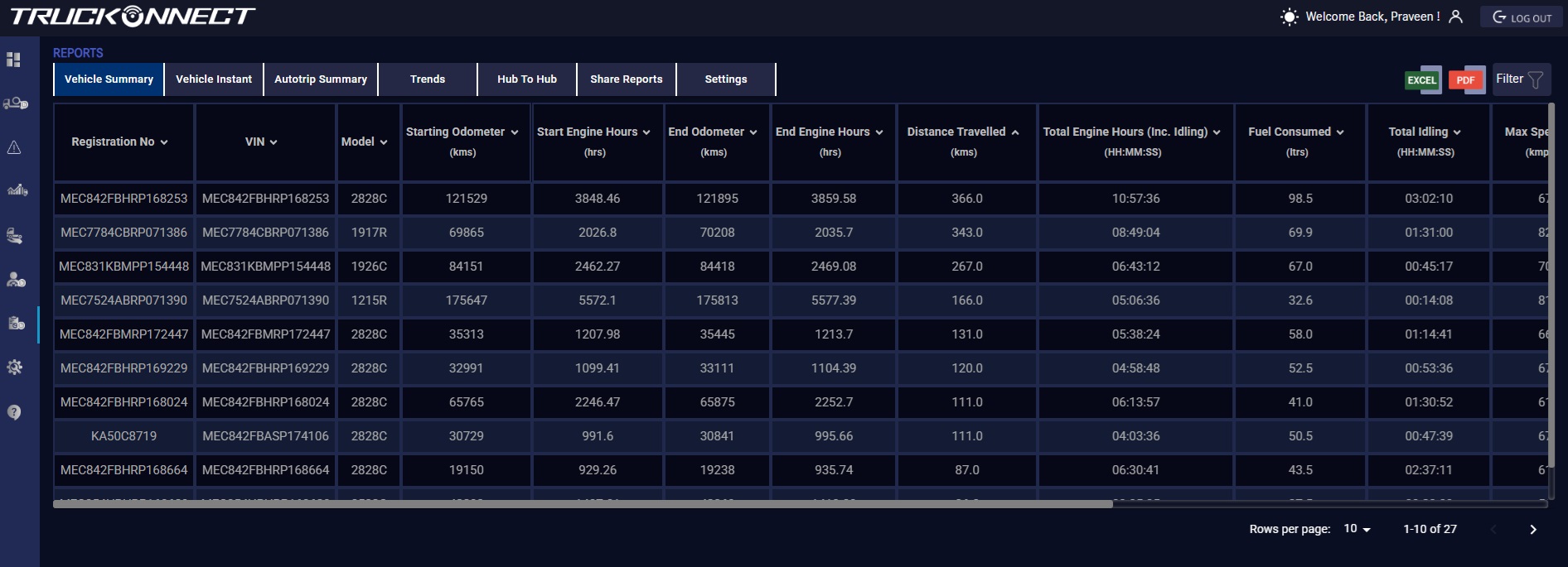 This application helps fleet owners in tracking vehicles real-time and monitoring vehicle parameters like vehicle speed, fuel, adblue, vehicle health, driver behavior and more. Using this application, fleet owners can optimize their fleet performance through features such as Fleet Analysis, Trip Analysis & Driving Analysis.