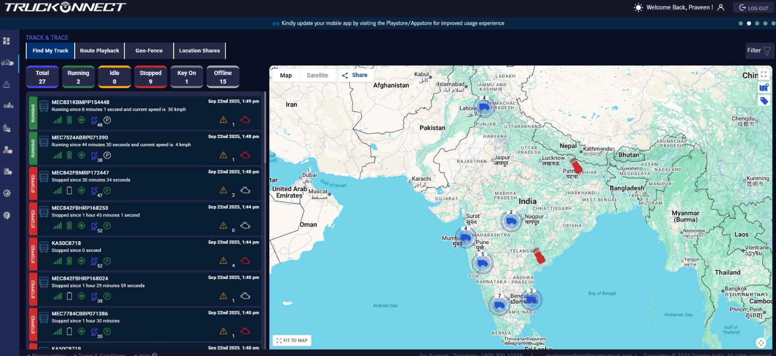 Find My TruckAllows Fleet Manager to know about the vehicle’s location, its running status, its current fuel and adblue levels, odometer and engine hour readings at fingertips